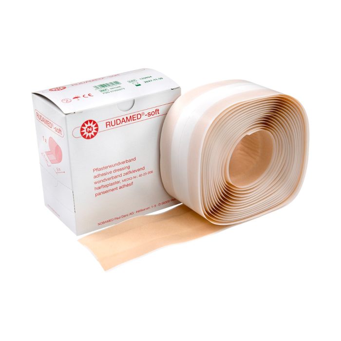 Rudamed® Soft is een wondpleister gemaakt van een beige elastische vliesstof, voorzien van een zacht, niet-klevend wondkussen en een hypoallergene polyacrylaatlijm. Het is daarom geschikt voor de gevoelige huid en wordt vaak gebruikt voor primaire genezing van kleinere verwondingen. De rol is verpakt in een kartonnen dispenser, eenvoudig op maat te knippen.