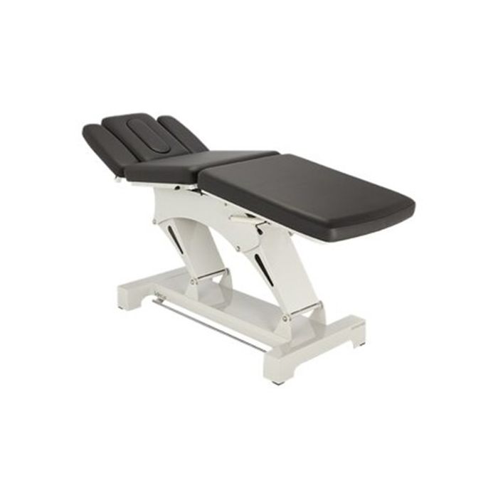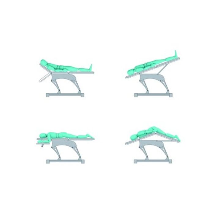 Het drie‑delige ontwerp biedt optimale flexibiliteit, terwijl de geïntegreerde voetbediening rondom de tafel handsfree hoogteverstelling mogelijk maakt. De stille, intrekbare wielen zorgen ervoor dat de tafel eenvoudig te verplaatsen is binnen de behandelruimte.